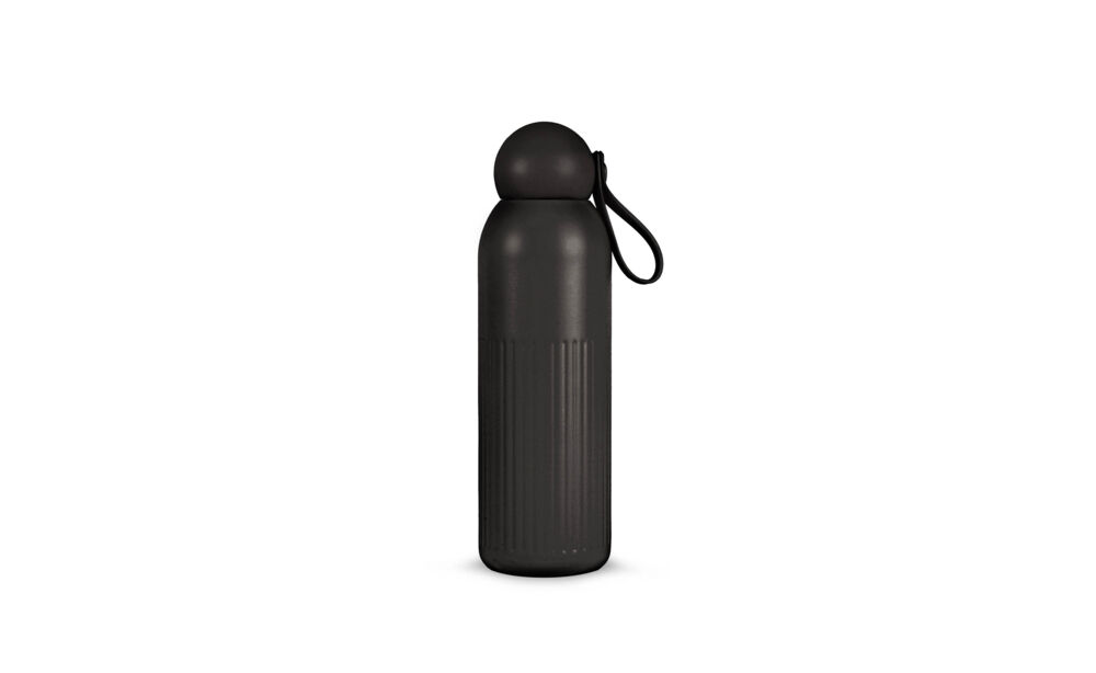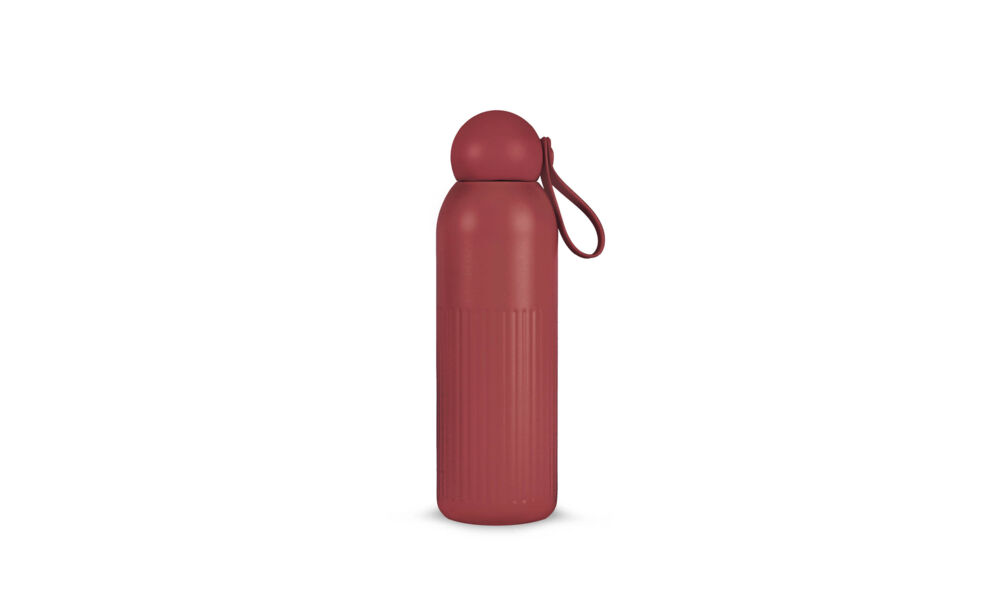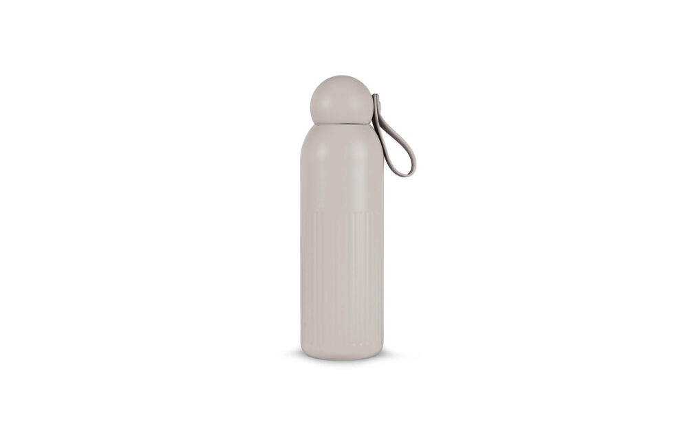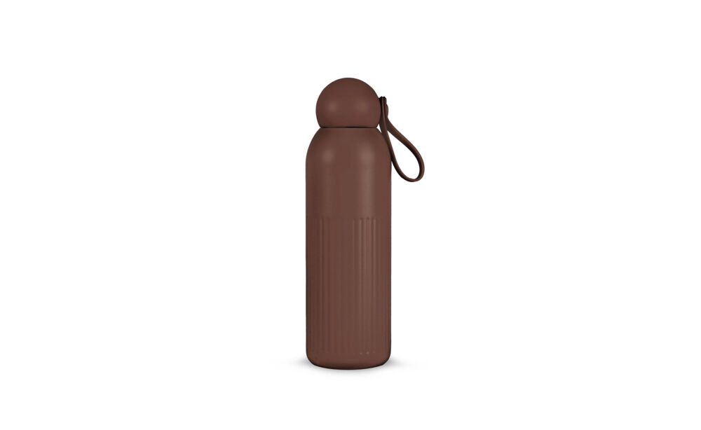 Gemaakt van gerecycled staal met vacuümisolatie en kopercoating: houdt dranken 12 uur warm of 24 uur koud zonder condensatie. Verticale strepen, een afgeronde dop van gerecycled plastic en een afneembaar rietje kenmerken het functionele design. Vaatwasserbestendig.