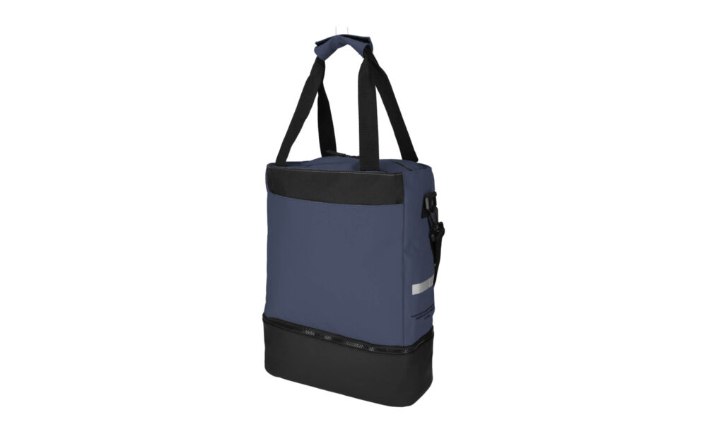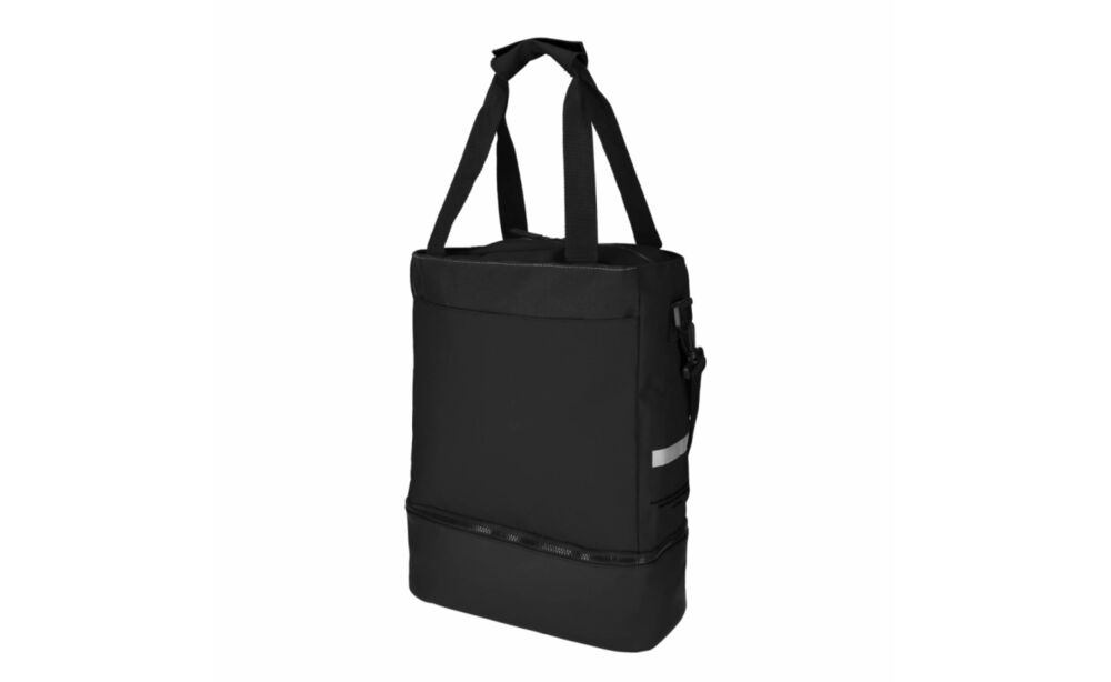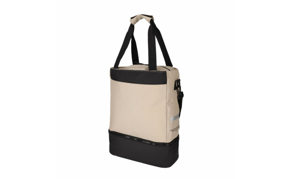 Het ritsvak van vegan leer geeft de tas een stoere touch. Deze tas is uitgerust met een groot hoofdvak en een ritscompartiment onderin dat door het isolatiemateriaal geschikt is om eten en drinken koel te houden. Daarnaast is de tas uitgerust met reflecterende strepen voor extra zichtbaarheid in het donker. De shopper is makkelijk mee te nemen aan de handvatten of schouderband en kan bevestigd worden aan een fietsendrager door middel van de fietshaken aan de achterzijde.