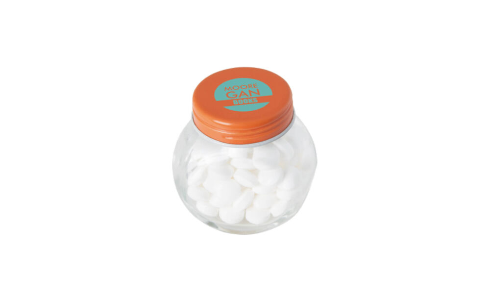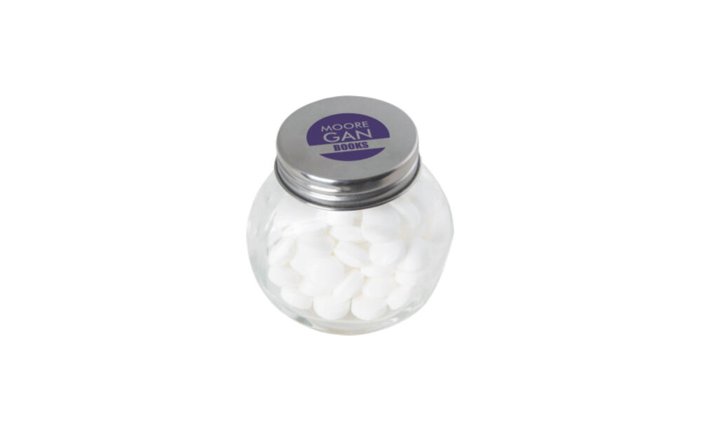 Dit kleine glazen potje is gevuld met ongeveer 40 gram mintjes.