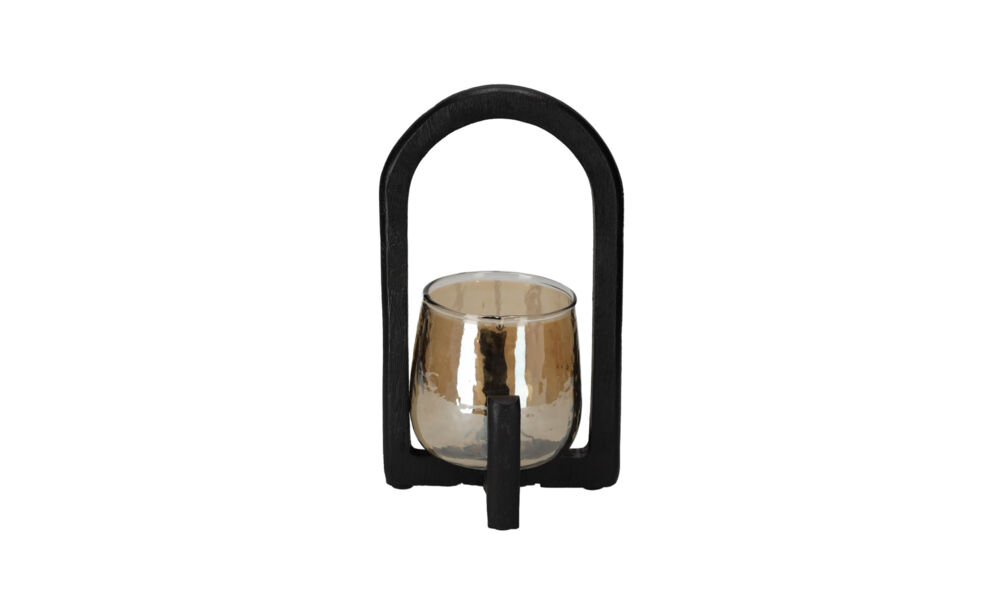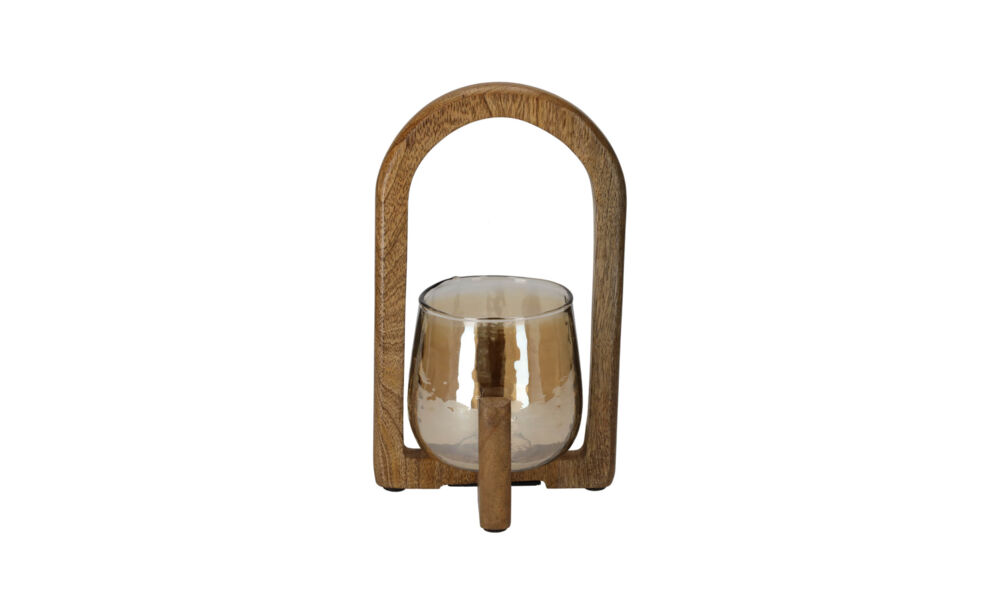 Deze stijlvolle lantaarn heeft door de combinatie van het gebogen houten frame en het warm getinte glas een rustieke uitstraling die past in moderne en landelijke interieurs. Door de unieke afwerking van het glas wordt het kaarslicht op sfeervolle wijze verspreidt door de ruimte.