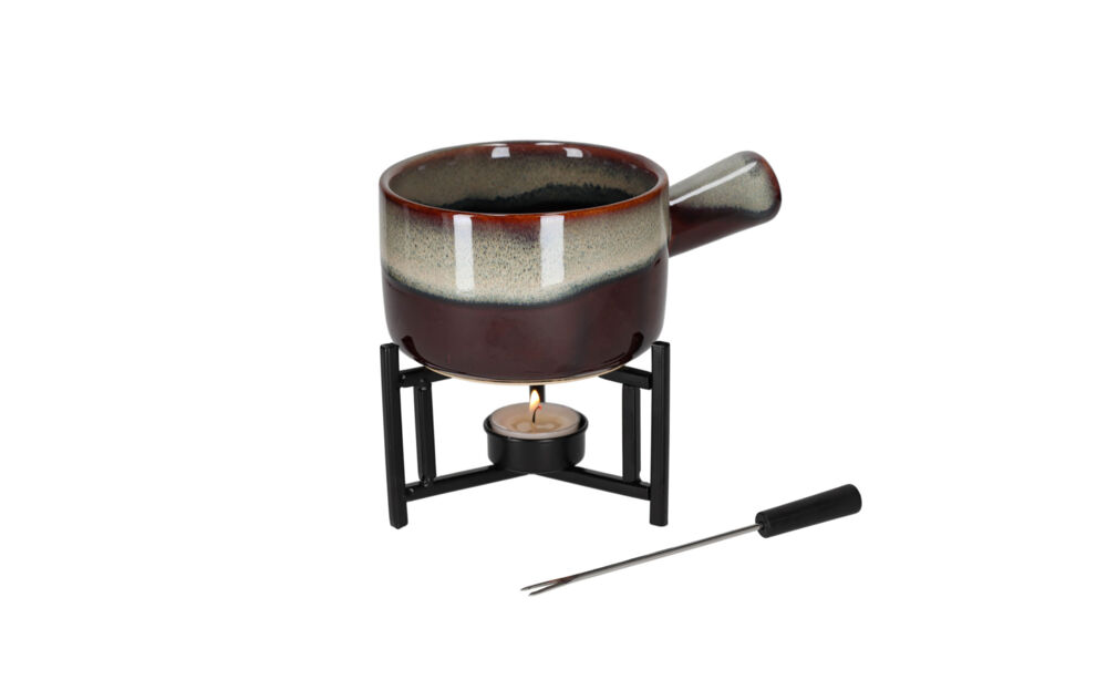 Maak elk moment extra gezellig met deze stijlvolle fondueset! Smelt heerlijke kaas of chocolade in de pan en geniet samen van een smakelijke fondue. De set bevat een fonduepan van 500 ml, twee vorkjes en een onderstel met plaats voor één theelichtje en is gemaakt van keramiek, hout en metaal.
